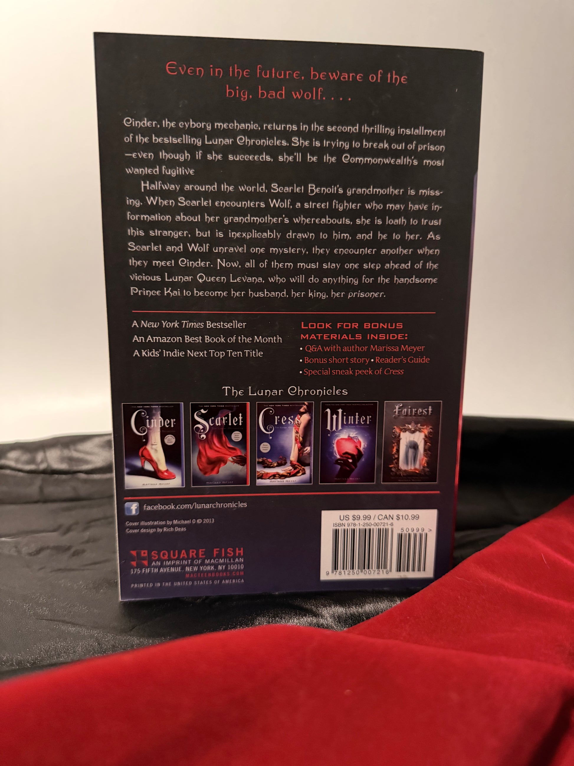 Halfway around the world, Scarlet Benoit's grandmother is missing. When Scarlet encounters Wolf, a street fighter who may have information about her grandmothers's whereabouts, she is loath to truth this stranger, but is inexplicably drawn to him, and he to her. As Scarlet and Wolf unravel one mystery, they encounter another when they meet Cinder. Now, all of them must stay one step head of the vicious Lunar Queen Levana, who will do anything for the handsome Prince Kai to become her husband, her king, her prisoner.